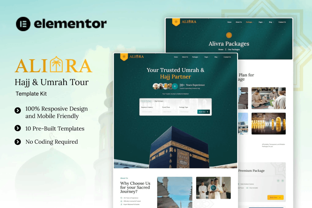 Alivra is a modern and elegant Elementor Template Kit designed for Umrah and Hajj travel services. Perfect for travel agencies, pilgrimage organizers, and group tour providers, this kit helps you showcase packages, highlight pilgrim experiences, and present your services with trust and professionalism. Alivra uses only free elements—so you can easily explore, customize, and launch your website with confidence and ease. Alivra provides various pages including Home, About Us, Packages, Details Packages, Pricing Plans, Service, Our Team, 404, Blog, Single Blog, Contact Us.