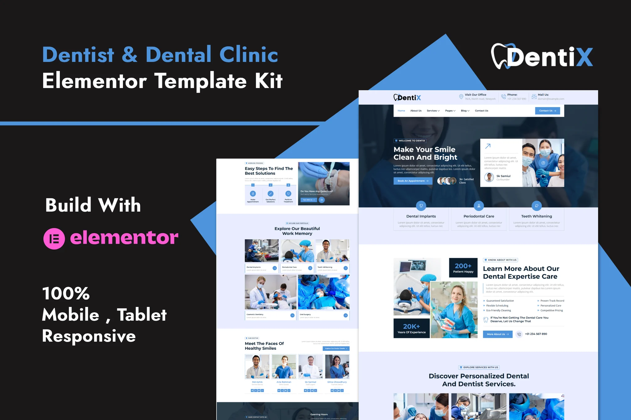 DentiX – Dentist & Dental Clinic Elementor Template Kit designed for any kind of services related to Dental Care Website, such as dental clinic, dental medical doctor, healthcare, and all kinds of dentist and dental care websites.