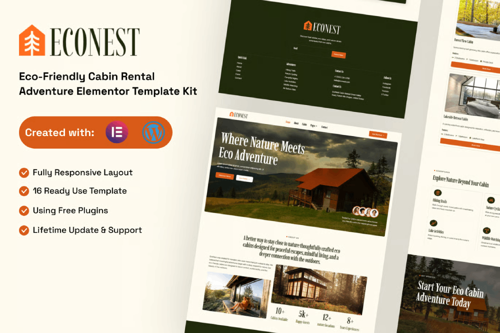 Econest is an Elementor Template Kit for eco-friendly cabin rentals, nature retreats, and outdoor adventure stays, crafted for sustainable tourism, nature-focused accommodations, and meaningful travel experiences. It features a clean and minimalist design with a modern layout style, suitable for the Elementor Free version. This kit is easy to customize and can be used by anyone without coding knowledge