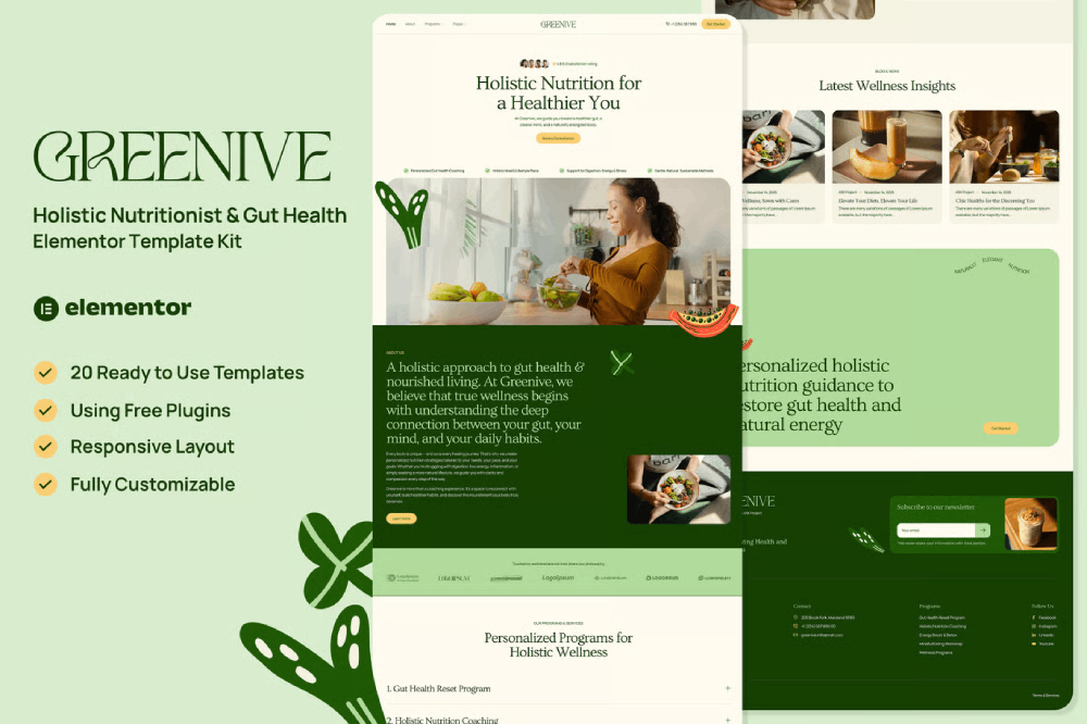 Greenive – Holistic Nutritionist & Gut Health Elementor Template Kit (NOT A WordPress Theme) is a modern, calming, and thoughtfully designed Elementor Template Kit made for Holistic Nutritionists, Gut Health Coaches, Wellness Consultants, Diet Coaches, and Mindful Living Experts. With soft aesthetics, clean layouts, and nature-inspired visuals, this kit allows you to present your services, programs, philosophy, and expertise with confidence and clarity.
