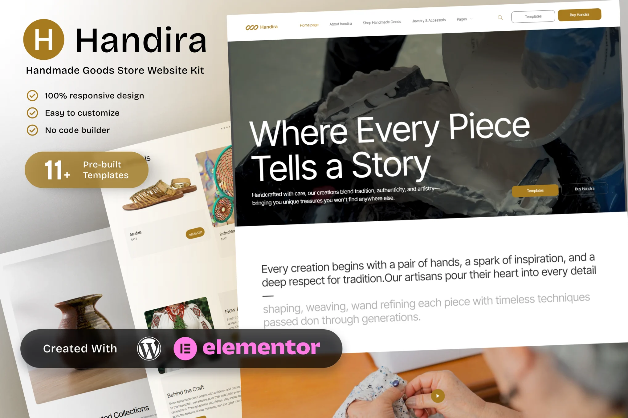 Handira is a beautifully crafted Handmade Goods Elementor Template Kit designed for artisans, craft sellers, boutique brands, and online handmade marketplaces. Its warm aesthetic and clean layouts help you showcase unique, handcrafted products with authenticity and storytelling at the center. This template kit includes essential pages like Home, About Handira, Shop Handmade Goods, Jewelry & Accessories, Home & Decor, Clothing & Fashion, Gifts & Specials, Artisan Stories, Blog, and Contact Us — all fully responsive and optimized for seamless browsing across all devices. Handira is perfect for handmade shops, craft sellers, local artisans, creative makers, small boutiques, Etsy-style brands, and sustainable craft stores seeking a professional, conversion-ready website. With strong SEO structure, product-focused sections, and engaging storytelling layouts, Handira helps elevate your brand presence and increase online sales effortlessly.