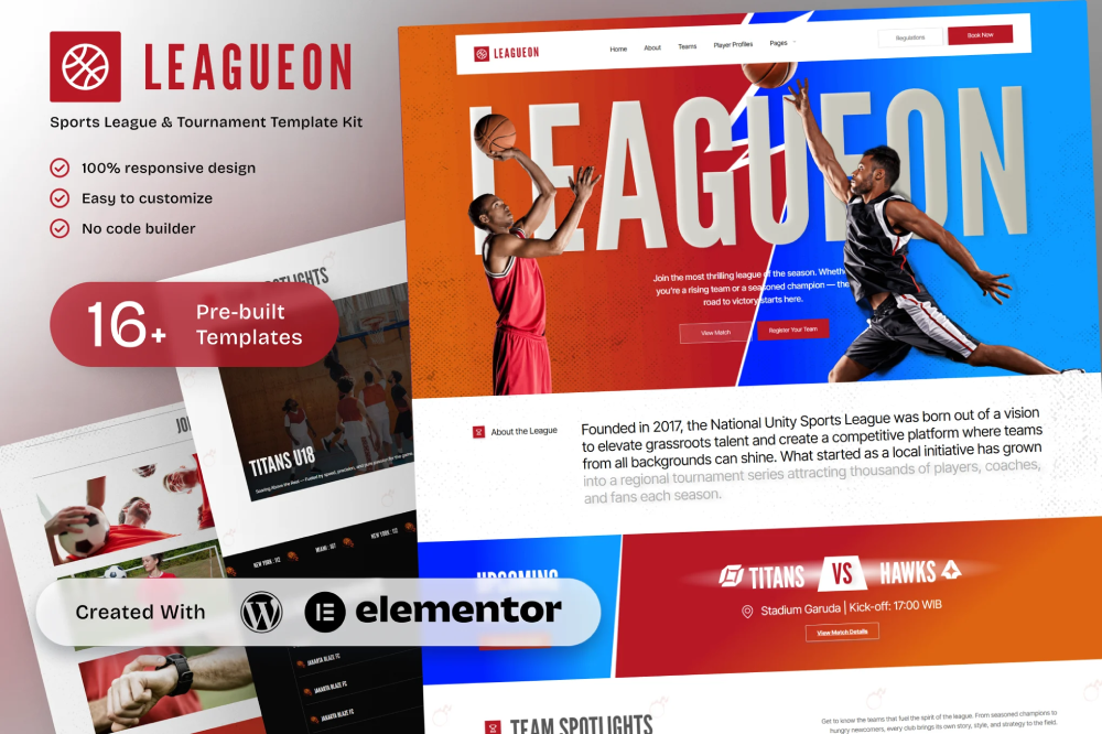 Leagueon is a purpose-built Sports League & Tournament Elementor Template Kit designed for football leagues, basketball tournaments, esports competitions, cricket clubs, and other competitive sports organizations. With a dynamic, mobile-friendly layout, Leagueon lets you showcase teams, players, match schedules, live scores, tournament brackets, and league standings—all editable with Elementor and no coding required. This kit includes: Home, About the League, Teams Overview, Player Profiles, Match Schedule, Live Scores & Results, Tournament Brackets, League Standings, News & Updates, Photo Gallery, Rules & Regulations, and Sponsorship & Partners. Perfect for league organizers, sports clubs, and tournament managers aiming to engage fans, showcase sponsors, and present matches in a professional, easy-to-navigate format.