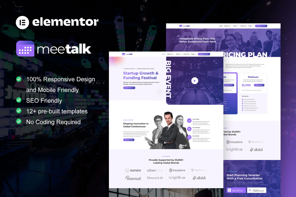Meetalk is an Elementor Pro Template Kit for Event & Conference website. This template has modern layout with modern simple, professional and clean style. Suitable for any business or service related to event & conference. You can easily build a professional website to announce events, exhibition, expo, festival, invitation, meeting, meetup, seminar, workshop, concerts, and many other events. Just drag and drop, no coding required. Save your time to make Event & Conference website with this elementor template kit. With Elementor Page Builder, you can easily edit or customize it, no coding required, just drag and drop.