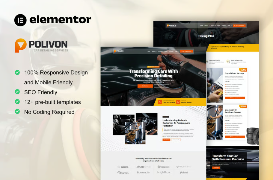 Polivon is elementor template kit for Car Body Repair Shop website. It has 12+ pre-built templates with modern design & clean style. This template kit ready to use for business and services related car detailing services such as car painting, car modification, car body repair, car mechanic, car maintenance, car mechanic, car detailing, car garage, car inspections.