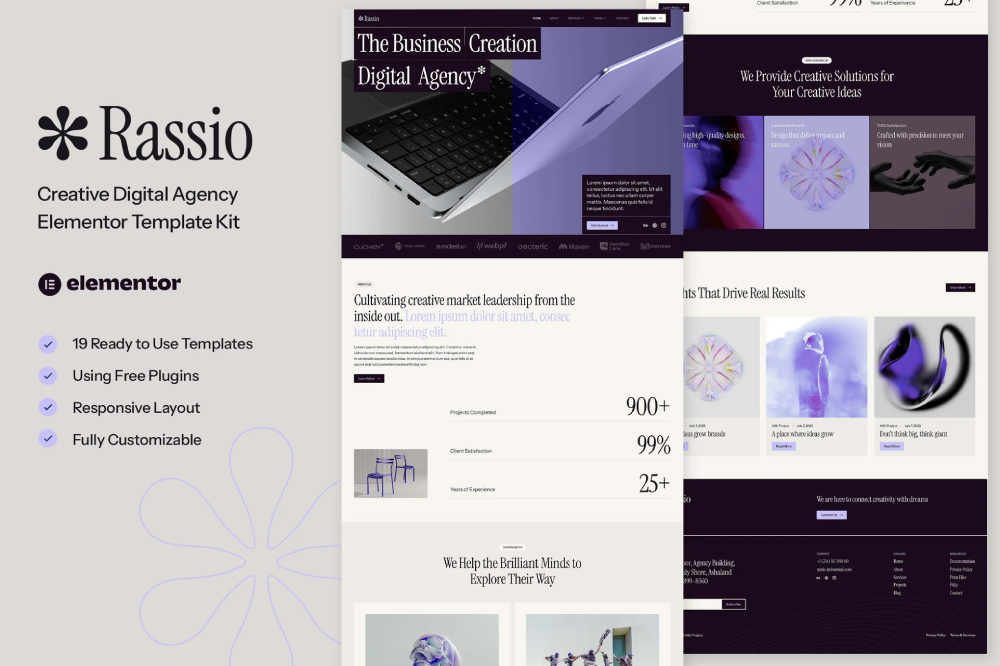 Rassio – Creative Digital Agency Elementor Template Kit (NOT A WordPress Theme) is created especially for digital agencies, creative agencies, web design agencies, showcases, portfolios and others who want to build or improve their agency website or their portfolio. Rassio has a simple, modern and clean design with 100% responsive layout, and very easy to customize and can be used by anyone without having to understand coding.