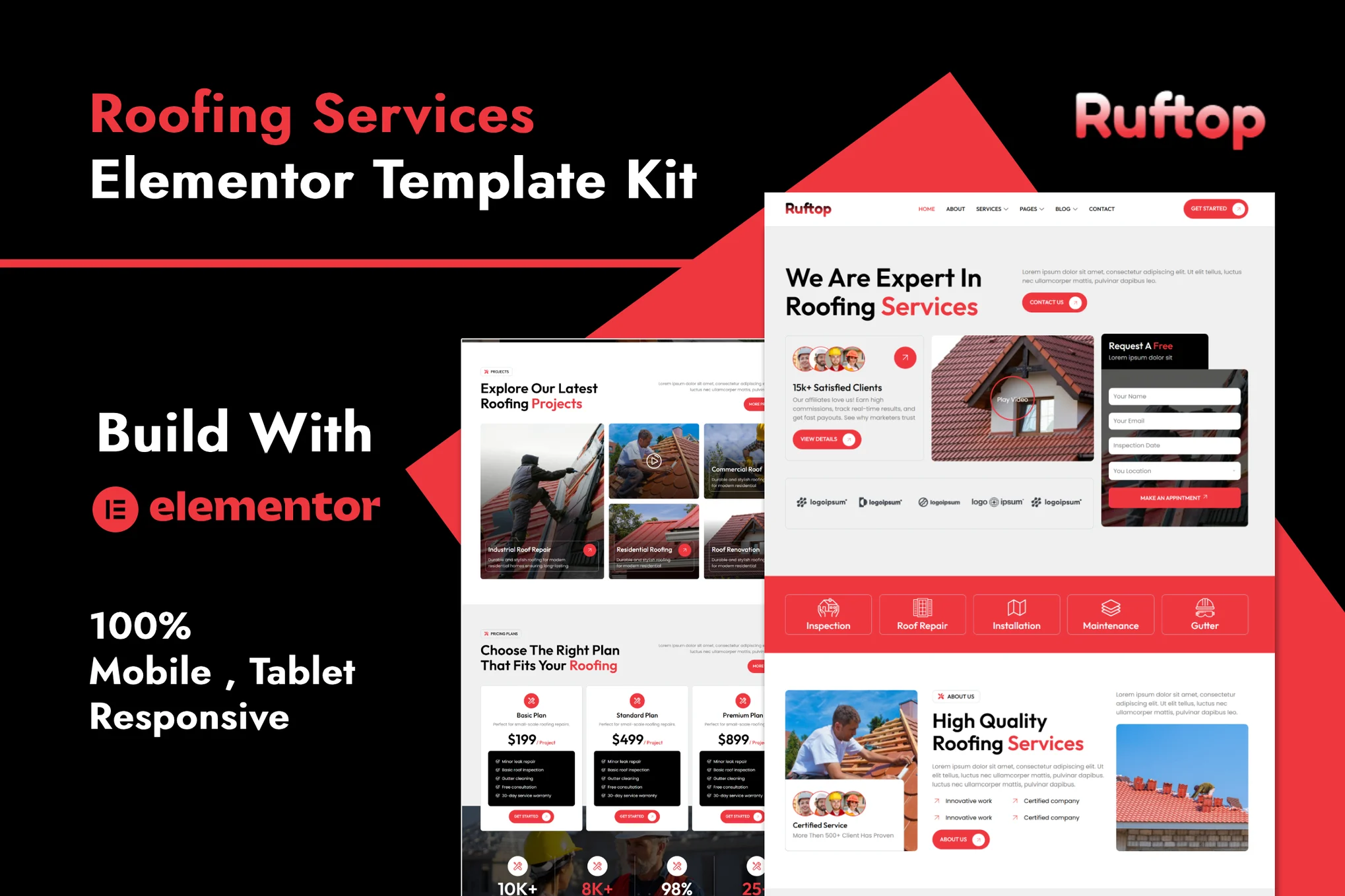 Ruftop – Roofing Services Elementor Template Kit is designed for industrial roofing, commercial roofing, construction, roof installation, maintenance, renovation, repair services, roof repair, roofers, roofing services, roofing companies.