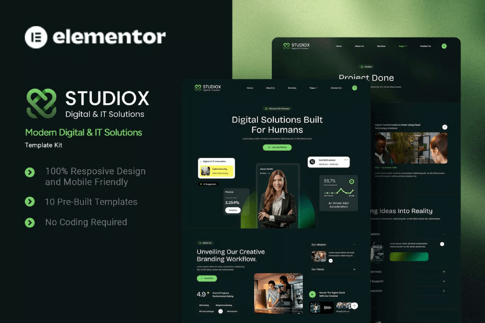 Studiox is an Elementor Template Kit for quickly and easily creating a full website in WordPress for your business featuring a modern and professional design. The kit features a fully compatible design system and professionally hand-picked images for a premium, branded head-start on your next project. Optimized for use with the free Hello Elementor theme, this kit is fine-tuned, fast-loading and fully responsive.