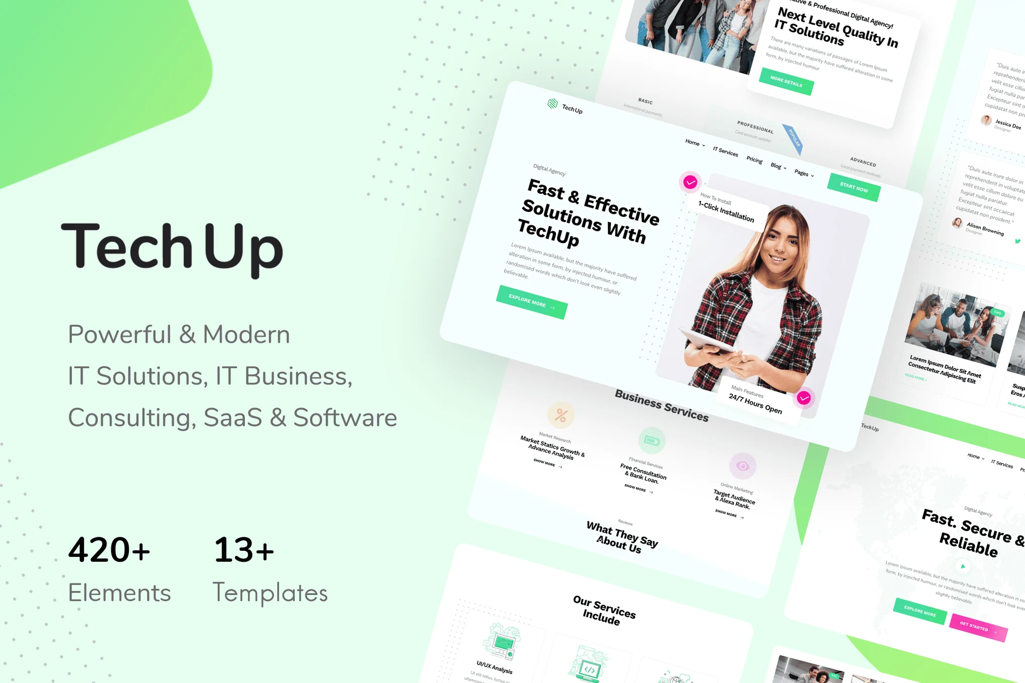 TechUp IT solutions & Services Elementor templates suitable for your Digital Agency, IT Business, Consulting, SaaS & Software, Startup website. You can use TechUp as a Creative way to showcase and promote your startup or running any digital marketing agency website.